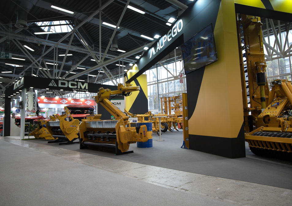 Impatto Visivo Landmark: L’allestimento è dominato da imponenti strutture aeree con il logo Alpego, caratterizzate da grafiche dinamiche in giallo e nero che richiamano la forza dei macchinari per la lavorazione del terreno.