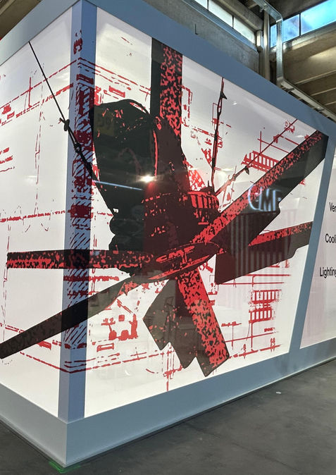 Trasparenze Scenografiche: L'utilizzo di ampie pareti in tessuto tecnico semitrasparente permette di intravedere l’interno dello stand, creando un effetto di leggerezza e respiro. Le macro-grafiche in rosso, che ritraggono l'iconografia del brand e i dettagli tecnici dei ventilatori, sembrano fluttuare nell'aria, attirando l'attenzione dei visitatori.