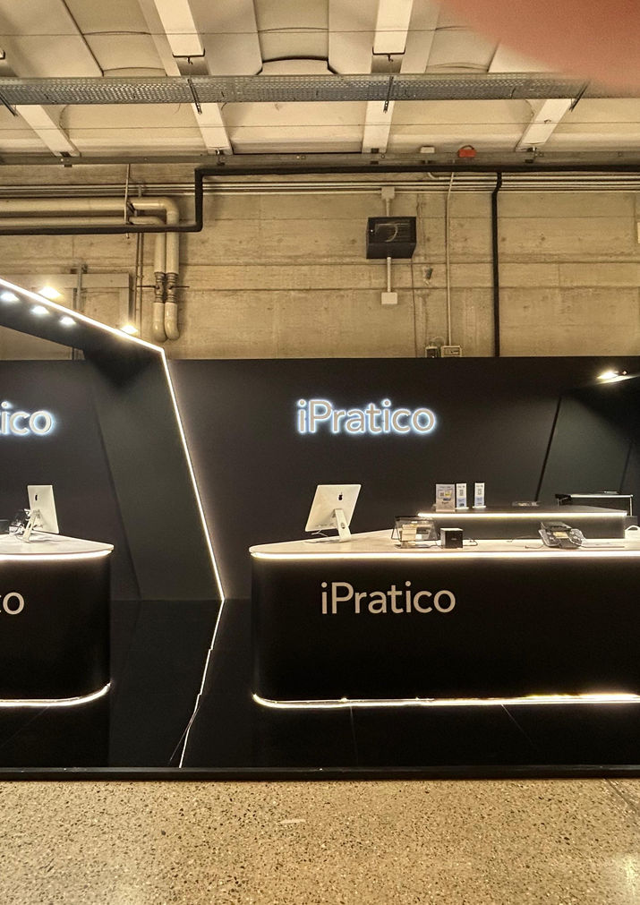 Focus sulla Visual Identity: Dalla scelta delle finiture nero lucido per il bancone alla retroilluminazione dei loghi, ogni dettaglio è stato eseguito da Metodo 79 per rafforzare la brand recognition e posizionare iPratico come il partner d'eccellenza per la digitalizzazione dei punti vendita.
