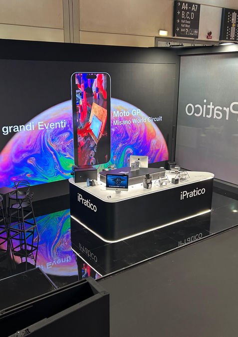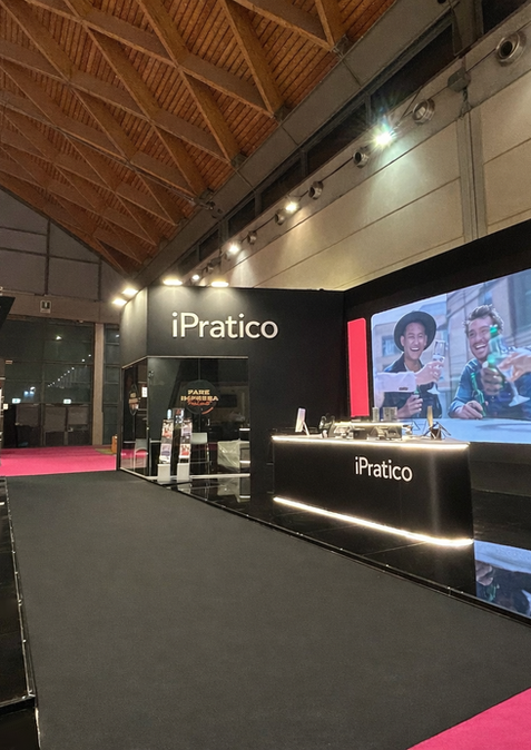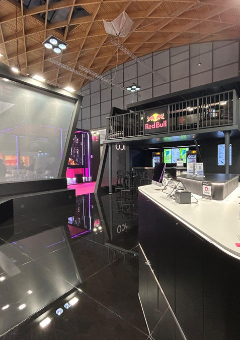Estetica Total Black e Contrasti Cromatici: L’allestimento gioca su una palette "Dark & Digital" dove le superfici nero opaco esaltano i monitor interattivi e i punti luce, creando un contrasto netto con l’energia dei loghi iPratico e Red Bull.