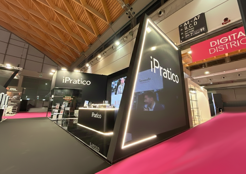 Il design dello stand rompe gli schemi tradizionali per abbracciare un linguaggio fatto di linee oblique e volumi sovrapposti, riflettendo la velocità e la precisione del software iPratico: